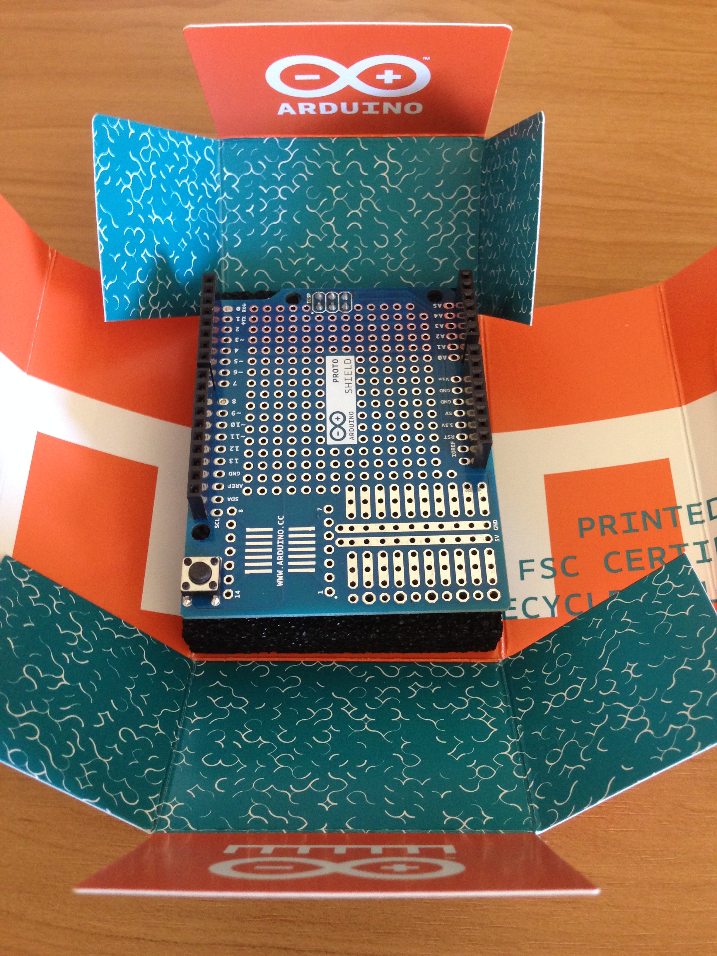 I also purchased an Arduino enclosure box, and a plain Arduino prototype shield. The prototype shield allows you to built a mini-circuit which can then integrate with the Arduino.