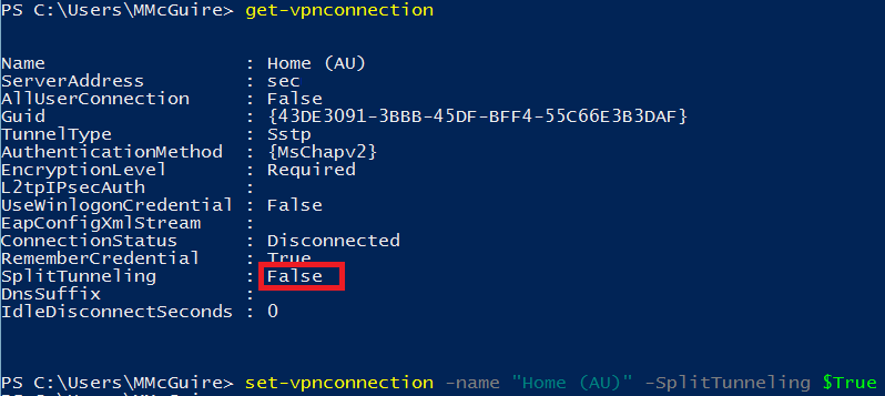 Using the Get-VPNConnection and Set-VPNConnection cmdlets you can enable split tunneling, which allows VPN traffic to traverse the VPN and normal internet traffic to bypass the VPN – resulting in the default route not being changed when you complete the VPN connection.
