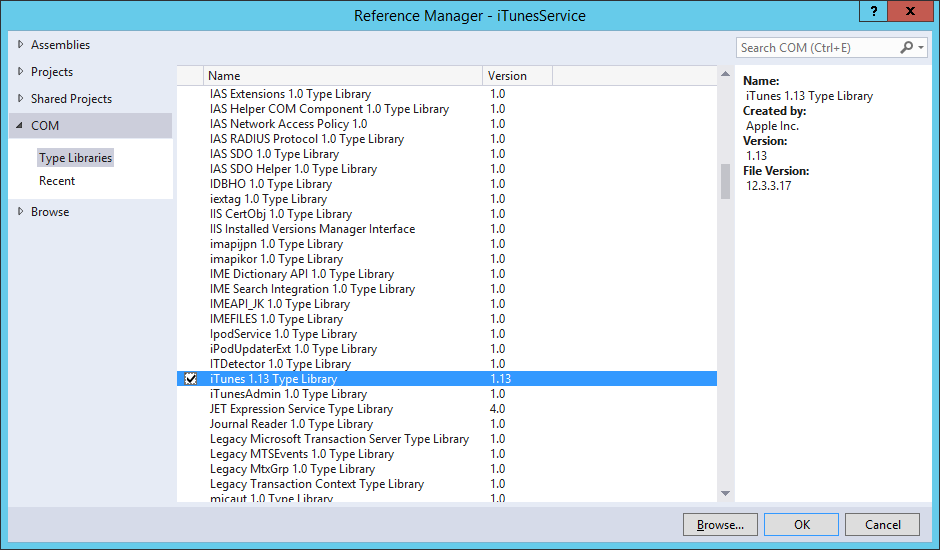 You’ll then need a reference to the iTunes type library – ideally this means you’ll need iTunes installed on your development system. We need this for gracefully exiting iTunes when the service is shutdown. You’ll also need it for manipulating the iTunes library from within your service – assuming that’s something you need to do.