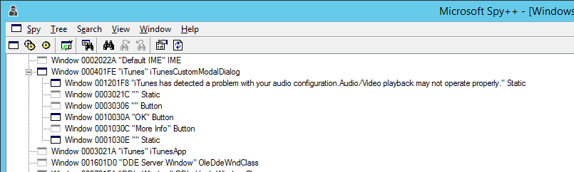 If you’re wondering how I was able to determine which class names to look for (e.g. the dialog box with the class name of #32770), I was using the Microsoft Spy++ application that comes with Visual Studio (spyxx.exe from the development tools command prompt). That allows you to spy on running applications, see which windows and controls they are displaying. From memory it only shows windows in your logged in session, therefore you’d need to run iTunes interactively to see what’s going on. The picture below reflects what you’d see when the audio error dialog box is on the screen. We first located the dialog box class – iTunesCustomModalDialog – and then enumerated through the child controls, looking at each label (Static) for the text, and then at each Button’s text until we matched what we needed.