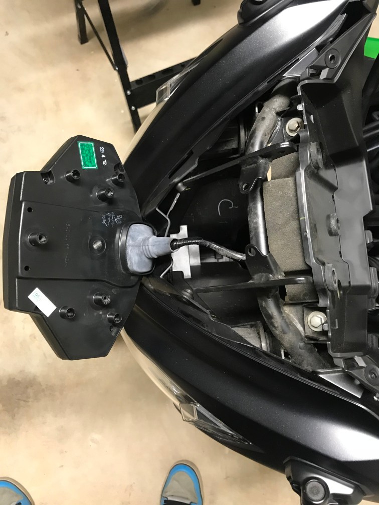 At first I thought the whole instrument cluster was causing the rattle, so I followed the instructions from this video showing how to disassemble the dash, and how to add some padding behind the instrument cluster. Unfortunately though, that did not fix the problem. I pulled everything apart again, and on a hunch, held the loose instrument cluster against the bike dash while the bike was idling – as soon as the instrument cluster touched the bike, the noise started again.