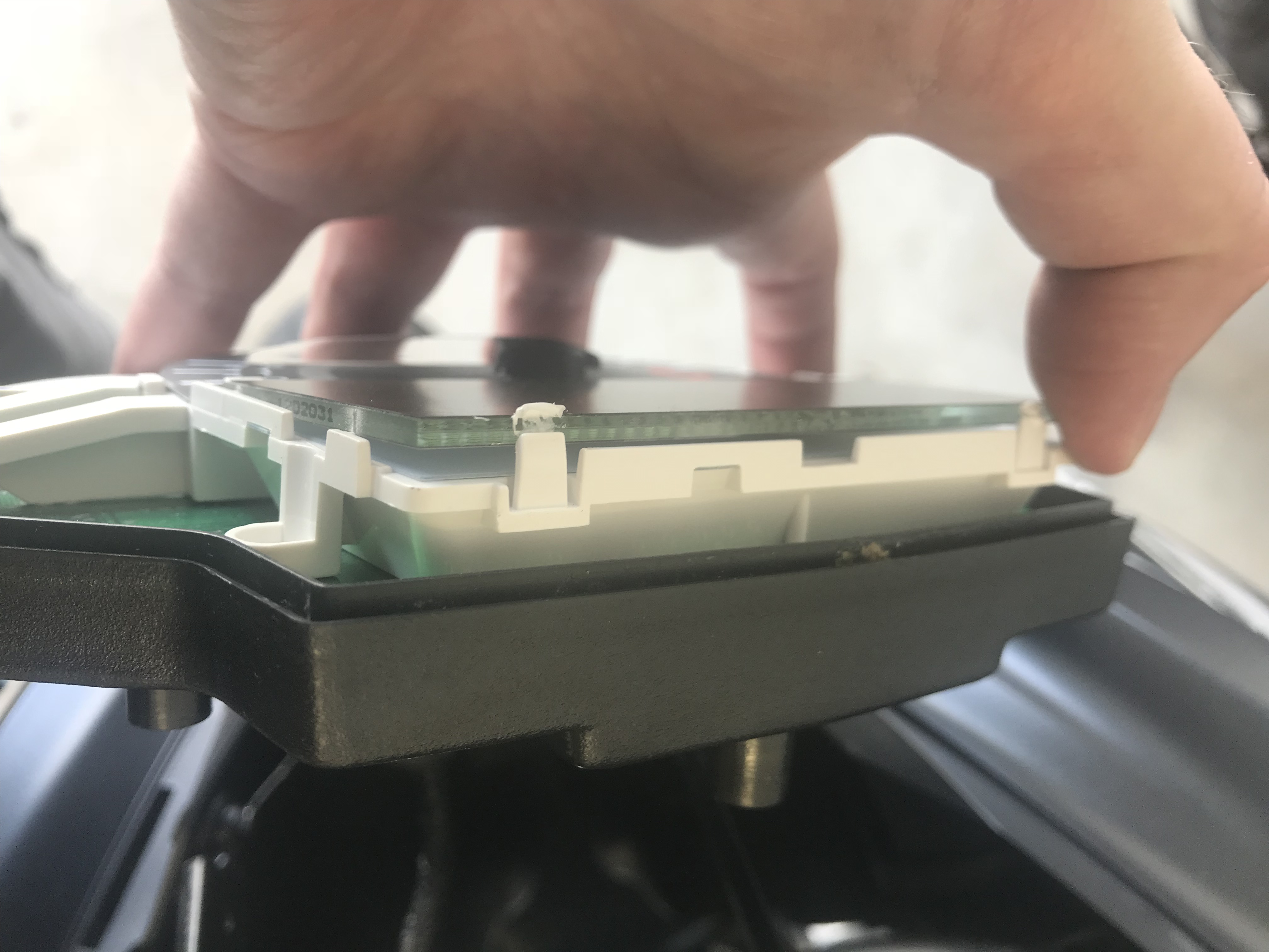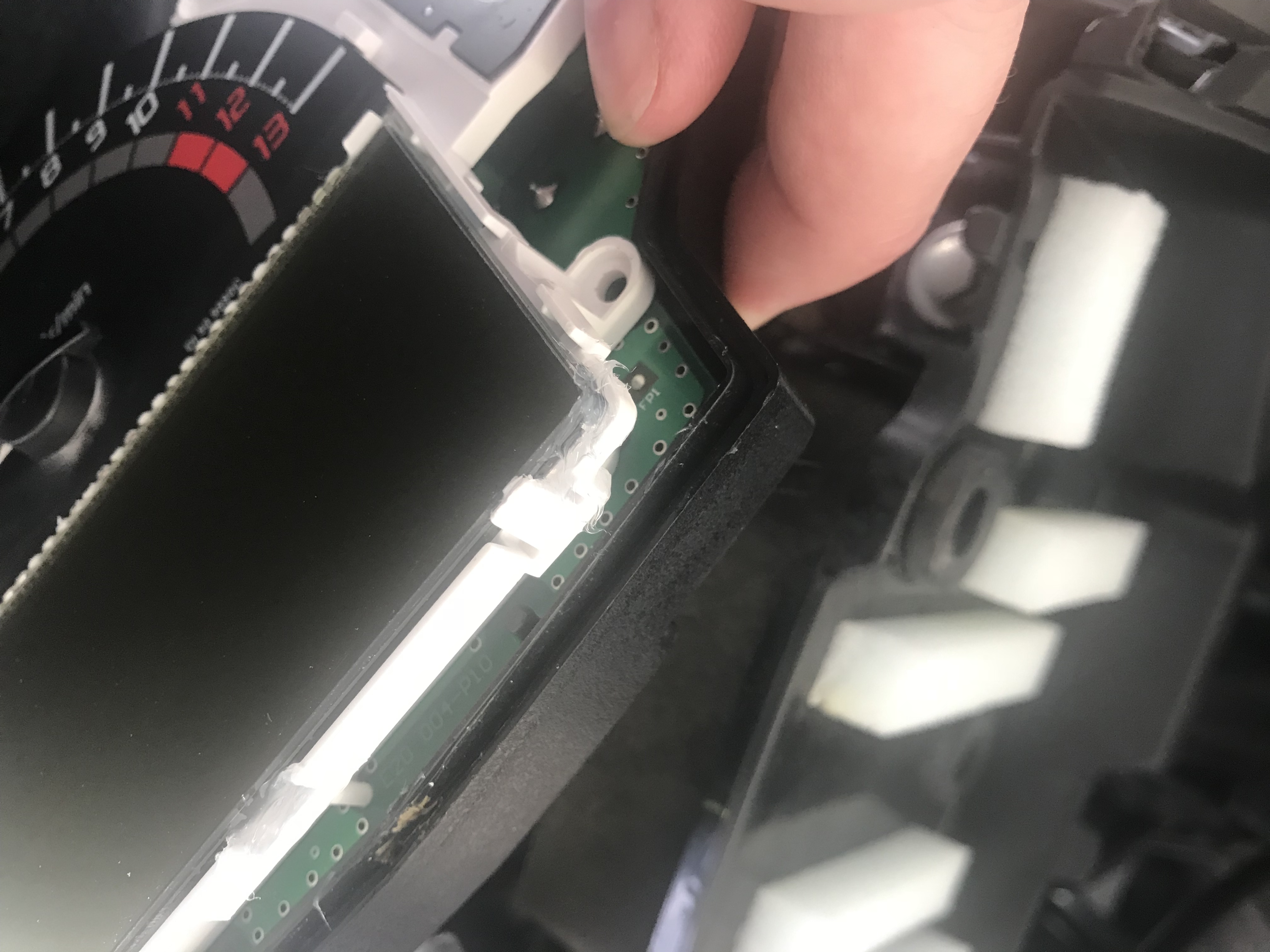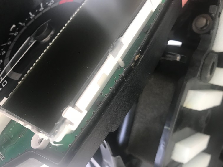 Now I unscrewed the four screws on the back of the instrument cluster (I left the cable plugged into it). Once I took the front cover of the instrument cluster off, I found a white powder all through the box. The powder was from the white silicon that was being used to hold the LCD screen in place; this seemed to have disintegrated, filling the box with silicon residue and allowing the LCD panel to bounce around against its plastic housing. You can see in the picture below where I’m using my thumb to pull the LCD screen up slightly. The white silicon on the top of the two vertical supports had worn away, and the LCD panel was bouncing downwards against the white plastic housing – rather violently.