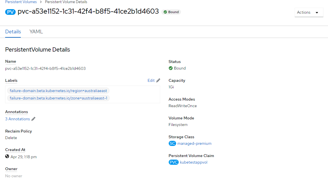 In the picture below, I’ve created a PVC using the above storage class. I linked the PVC to a deployment and due to the WaitForFirstConsumer setting, the disk was provisioned upon first start of the pods.