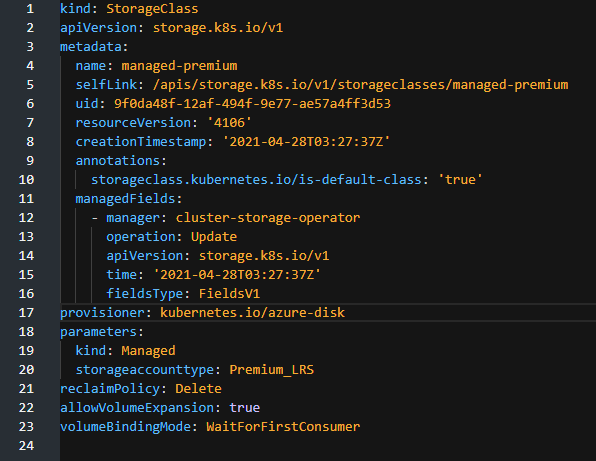 When you deploy an Azure Red Hat OpenShift ARO cluster to your Azure instance, a default storage class is created for Azure Disk Premium SSD. ARO is able to consume Azure storage using built-in provisioners. The example below specifies the use of premium Azure Disk with local redundancy. The Kubernetes documentation includes parameter information for controlling how the Azure resource is provisioned.