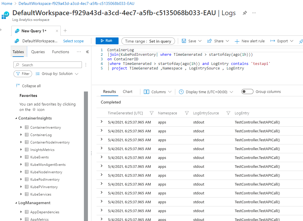 The screenshot below shows the Log Analytics Workspace in effect with a query executed to return stdout log information from one of the containers I was running in the ARO instance. This is the behavior you’d observe with AKS.